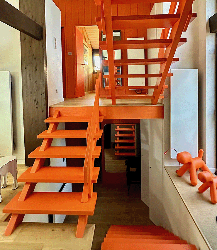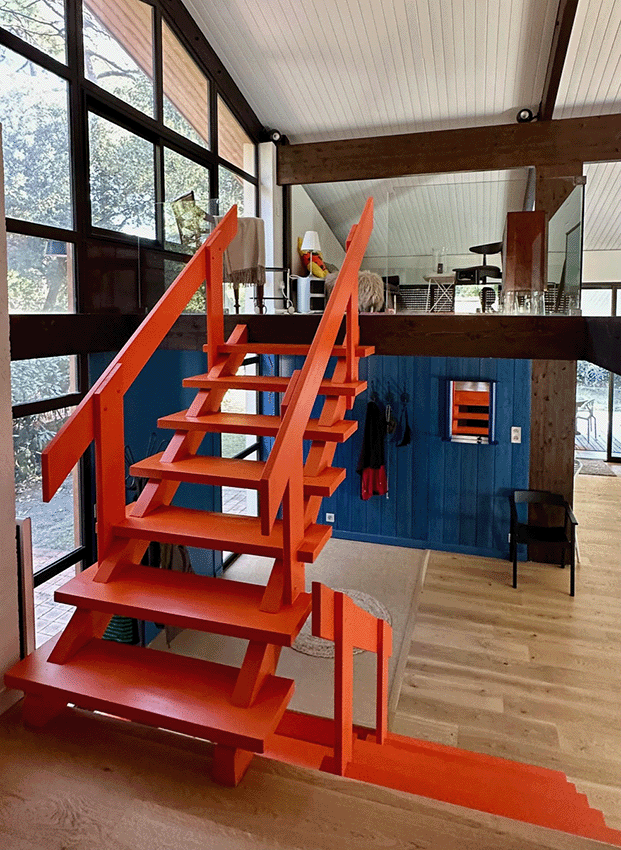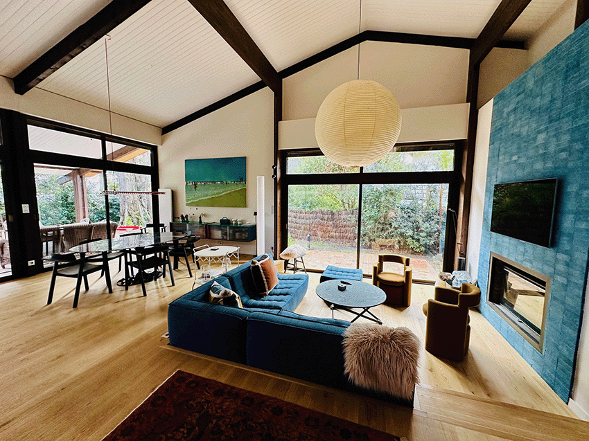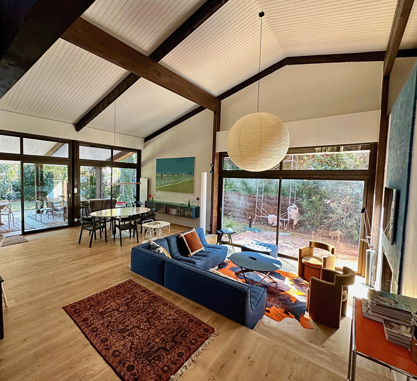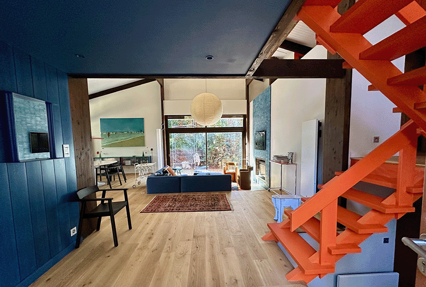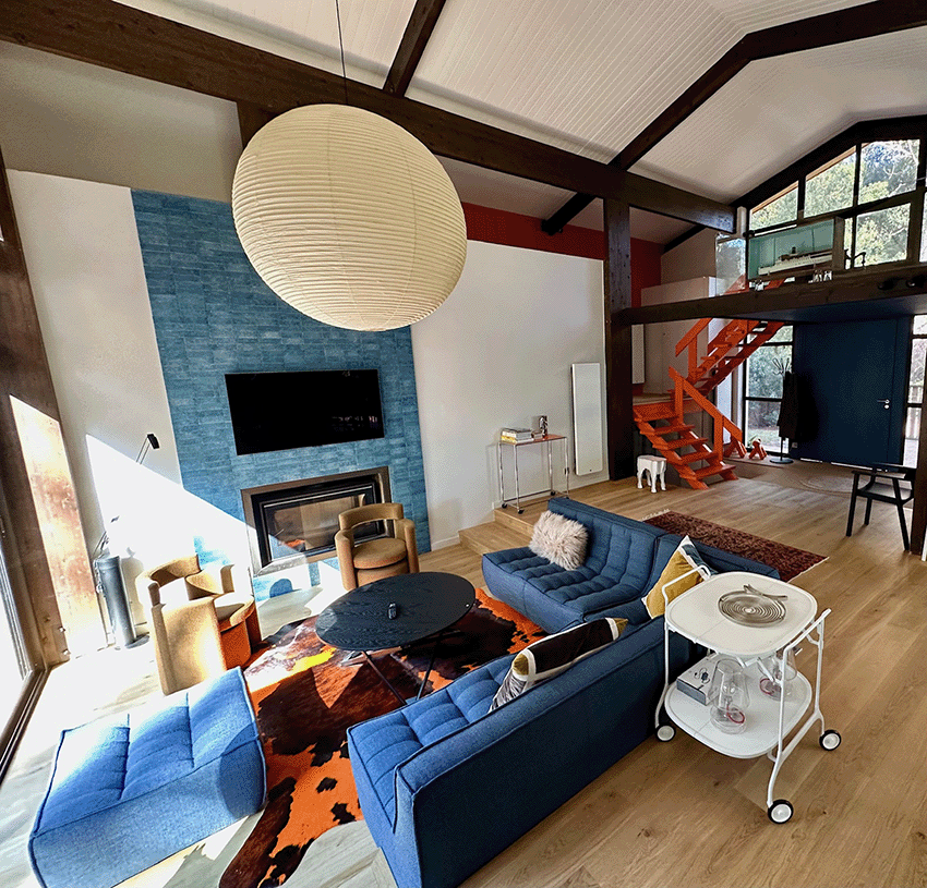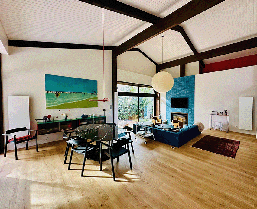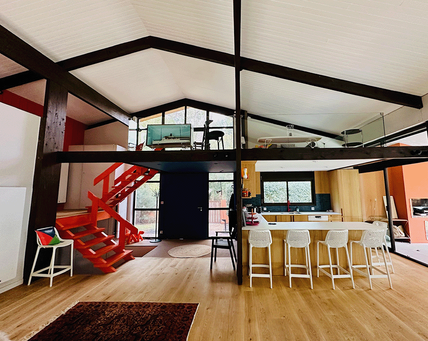 – De plain pied, une immense pièce de séjour avec toit cathédrale et cheminée