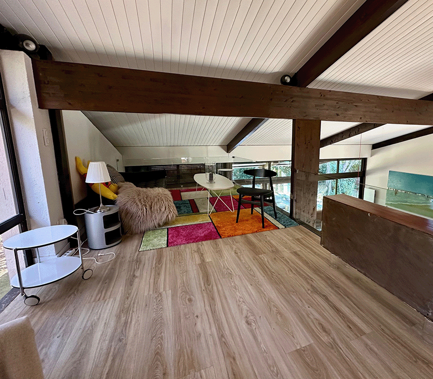 Une mezzanine en surplomb du salon permet d’envisager la possibilité de créer une 5 ème chambre ou un espace bureau.