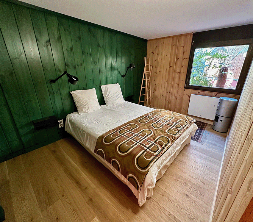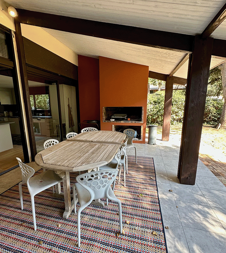 – Une immense terrasse couverte par le rampant de la toiture qui permet à l’inter saison, de jouir d’une véritable pièce supplémentaire, avec coin repas, cheminée et salon d’été